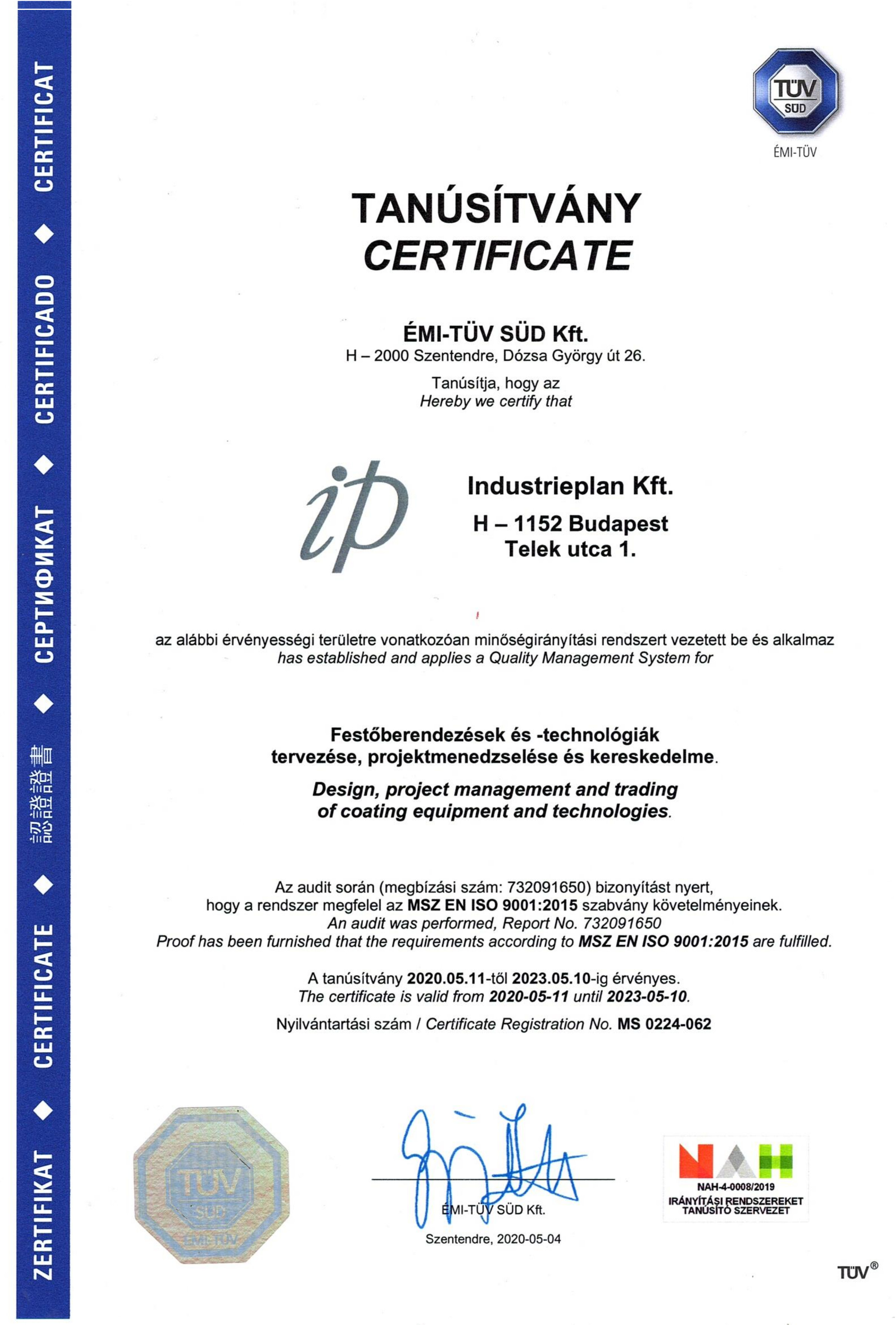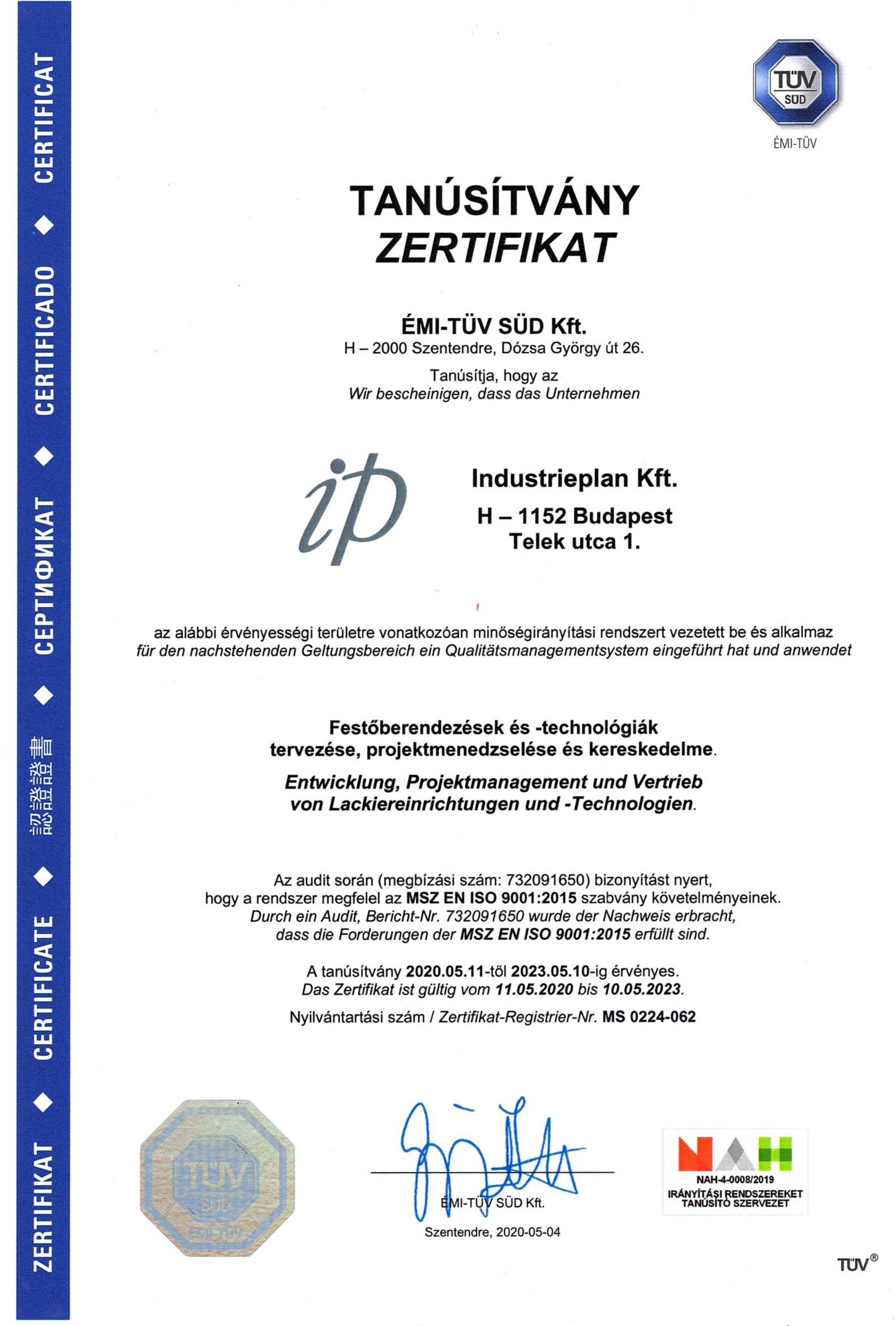 Az Industrieplan Kft. egészen 2023 közepéig, ismételten megkapta az ÉMI-TÜV tanúsítvány-t!