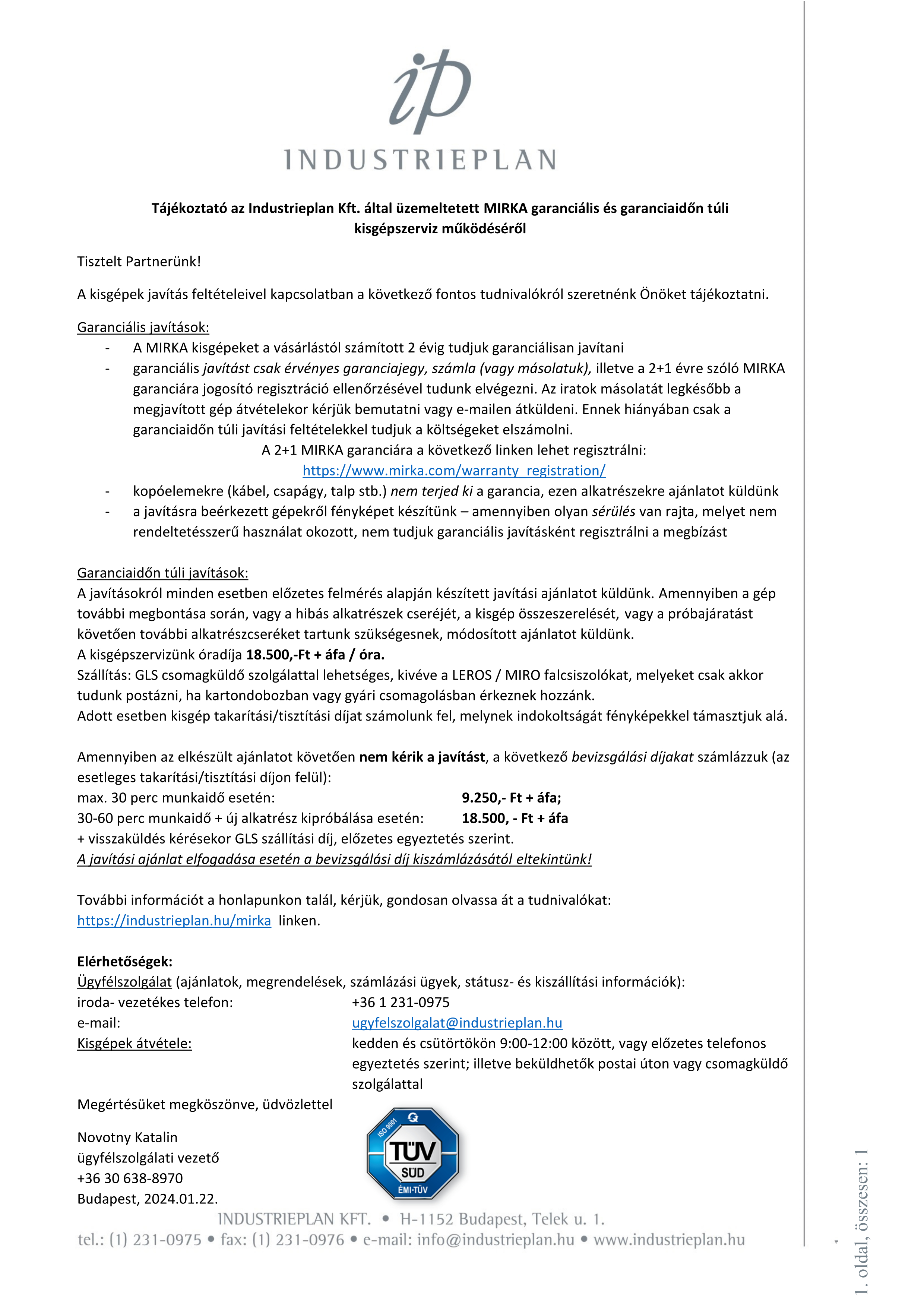 Tájékoztató az Industrieplan Kft. által üzemeltett MIRKA garanciális és garanciaidőn túli kisgépszerviz működéséről.
